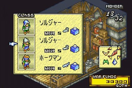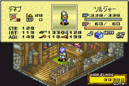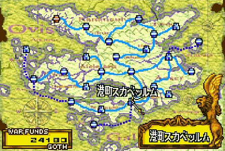 Secrets IV. Fortune Teller Q's and A's X. Glycinia Locations 1. When attacking enemies, try to single out targets. A good idea is to single out enemies that are isolated or are weak. By singling units out, you will take less damage and be able to manager your troops more efficiently. 2. Spears and whips can be used for various purposes. Spears and whips can be used from a distance to prevent a counterattack. But remember when a spear or whip is used from a distance, it will only do half the damage that an attack standing next to someone would do. Giving spears and whips to other units beside beast tamers or valkyries is not a bad idea. My main character, who is a swordmaster, uses the special black spear. There is a difference between spears and whips. Spears can go through two characters standing next to each other; whereas, whips can only hit one character. A little trick I like to do is have an enemy in between any two characters with spears and attack with one. The other spear user will counterattack back through the enemy for extra damage. 3. Check class compatibility and enemy health when persuading. You will greatly increase your persuasion success rate if you know which classes to use. For example, swordmasters persuade archers and ninjas with ease. Although male and female versions of the same class persuade equally well, the female only classes have a wider range of compatibility. If you have no compatible classes available then at least use someone with the Arbitration emblem. Weakening down the target is a must but you do not need to get someone down to an inch of life just to persuade them. Getting the target under a third of health is plenty. Feel free to suspend the game before persuading so that you can go back if you fail. For a complete persuasion table visit the classes section. 4. Mobility is key. When characters are equipped with accessories that allows them to fly or warp they are immune to obstacles and height. They are able to travel unrestricted over any terrain. Those equipped with warp items are very efficient at killing hard to reach or weak enemies (sirens, gremlins). Warp items are best given to melee characters such as swordmasters, knights, or dragoons since they cannot effectively fight without sufficient mobility. 5. In castle battles, remember that your forces will be split up. When you fight at any castle (Ostorea and Angel's Headstone), your units will have to split up to fight each side. They CANNOT be used to fight on both sides. This has been changed from the original Tactics Ogre where you only had to fight one of them. Try to make each squad balanced or suitable to the battle environment. When both sides are completed, the two forces will join back together for the battle inside the castle. One trick is that if you can send your entire army of 8 or less characters down one path you will skip the other. This is not advisable because you have to keep a small army and will miss a few special items and spells at Ostorea. Remember that you can always go to a stage and view it and then reset your GBA. 6. Beating Shaher in his final form can be tough.