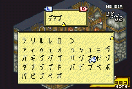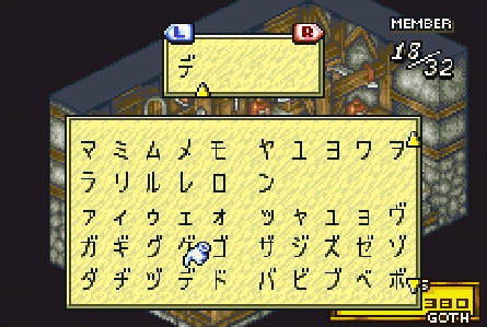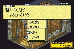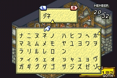 Alphonse alive at all costs! MUSIC.ON Allows music test. Enter it as a name of the main character or a recruited character. Once the game is beaten, more music is unlocked. (Only on English version) DEL.DATA Deletes all saved data. Enter it as a name of the main character or a hired character. (Only on English version) English codes discovered by one2treefor5 MUSIC_ON Allows music test. Enter it as a name of the main character or a hired character. Once the game is beaten, more music is unlocked. (Only on Japanese version) DEL_DATA Deletes all saved data. Enter it as a name of the main character or a hired character. (Only on Japanese version) * The Deneb code for the English version* Recruit a female soldier with either N or C alignment and name her Deneb. The element does not matter. Leveling up as a wizard or cleric is recommended. Give her the Vixen's Whisper emblem by having her persuade a male character. Remember, use like classes so if you want to persuade a soldier make her a soldier or a knight. Once she has 38 MP and 35 intelligence she will be able to become a witch. Just change her to a witch and she will transform. Deneb can use witch and summon magic with the additions of Faith, Tranquillize, and Cursed Existence. Her charm ability is excellent. Get her at the lowest level you can to take advantage of her high stat growth. Now that you have her the secret shop at Scabellum will open up. Refer to that section for information on the shop. If you should dismiss, snap, kill, trade, or otherwise lose Deneb you can get her back by making another witch named Deneb. * The Deneb code for the Japanese version* The code is identical to the English version except for what you name her. Because the vast majority of those visiting this site cannot understand Japanese (myself included) the steps have been outlined one by one so that the code is done correctly. Step 1. Recruit a female character and give her any element. Step 2. Use the 2nd name choice (katakana) and insert the name using the exact 3 signs below.